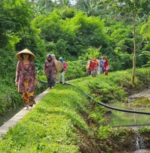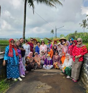Keguyuban di antara mereka juga terasa saat menyiapkan kebutuhan di Saung Raya. Bayangin, ada salah satu peserta, Hanny namanya, yang rela berat-berat bawa kebaya sekian stel dari Magelang untuk dipake buat foto-foto. Maklum, para Ras Terkuat di Muka Bumi (baca: emak-emak) mau befotoan ala gadis desa di sawah yang memang ada di sekitar penginapan dengan dresscode kebaya. Sebagai bukti, lihat aja di foto yang ada dalam tulisan ini.
