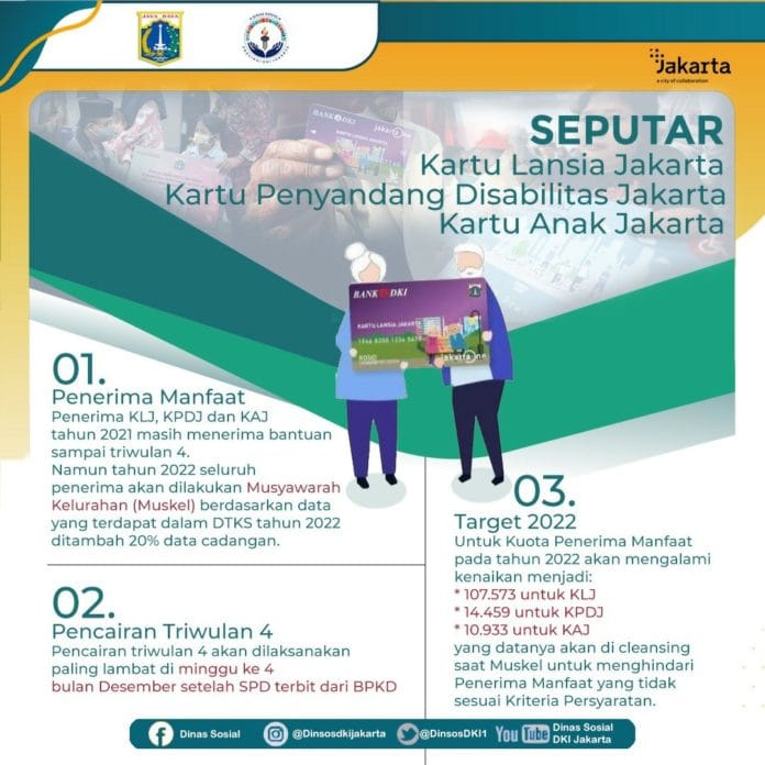 Akun Twitter @DinsosDKI1 mengunggah infografis tentang Kartu Lansia Jakarta (KLJ), Kartu Penyandang Disabilitas Jakarta (KPDJ) dan Kartu Anak Jakarta (KAJ).