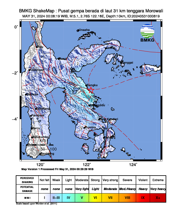• Dirasakan: (Skala MMI): III-IV Morowali