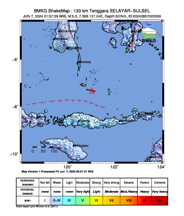 - Pusat gempa: 133 km Tenggara SELAYAR-SULSEL